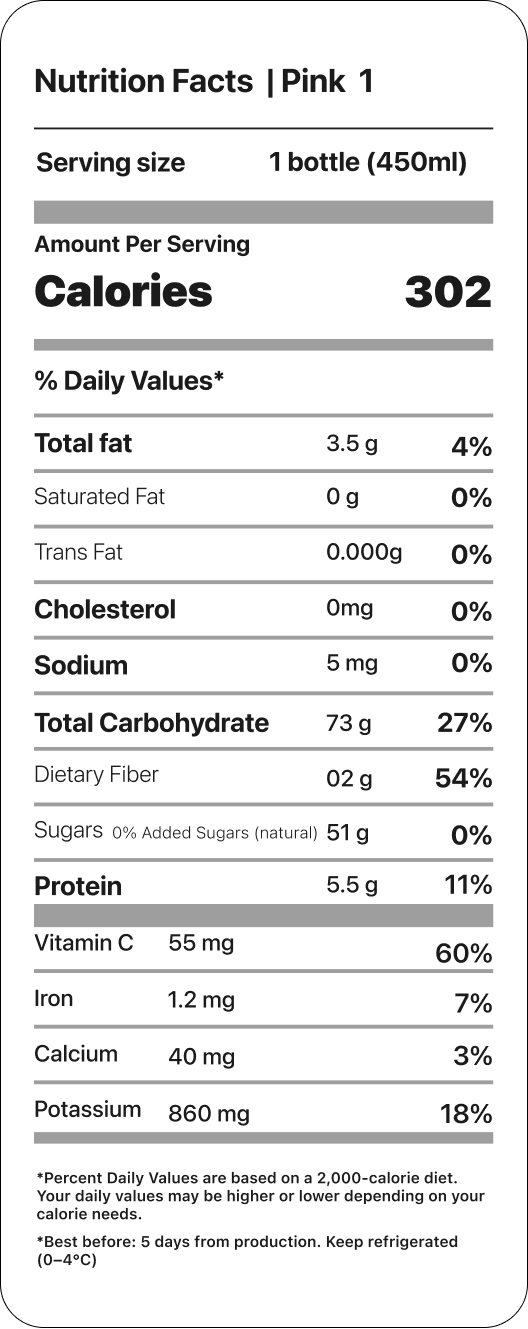 عصاره پرس سرد شکوفه ترکیبی خوشمزه و طبیعی از انار و سیب قرمز است که برای آوردن گرما و شیرینی به ماه‌های سرد زمستان تهیه شده است. رنگ صورتی درخشان آن چشم‌نواز است و طعم طبیعی شیرین و ترش آن، موجی از انرژی و تازگی را به ارمغان می‌آورد. سرشار از آنتی‌اکسیدان‌ها، ویتامین‌ها و لمسی از لیموی تازه، این عصاره هم مقوی است و هم بی‌نهایت خوش‌طعم.